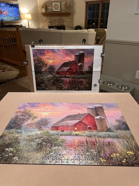 I grew up on a farm. And the moment I opened this puzzle and saw that red barn, that sunset, that peaceful countryside scene — it took me right back. Back to my childhood, back to my Mom and Dad, back to a simpler time that lives in my heart. I could feel it the moment I started sorting the pieces.